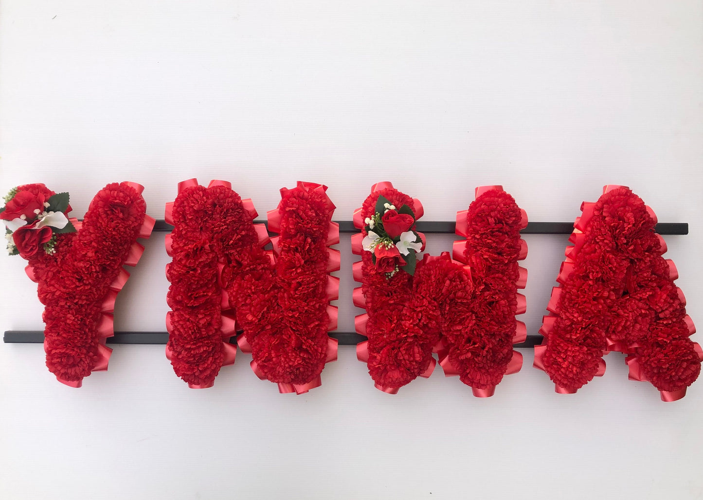 4 Letter Funeral Flower Letters, made from Artificial Silk Flowers, waterproof suitable for Grave or Memorial Garden or Cemetery. Hand Made From Artificial Silk Flower Carnation Base and Matching Rose Cluster Spray, Choose Any Colour Carnation Base Colour or Ribbon Colour From The Dropdown Menus.