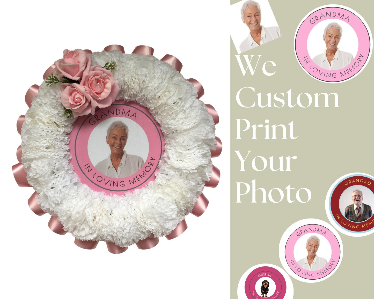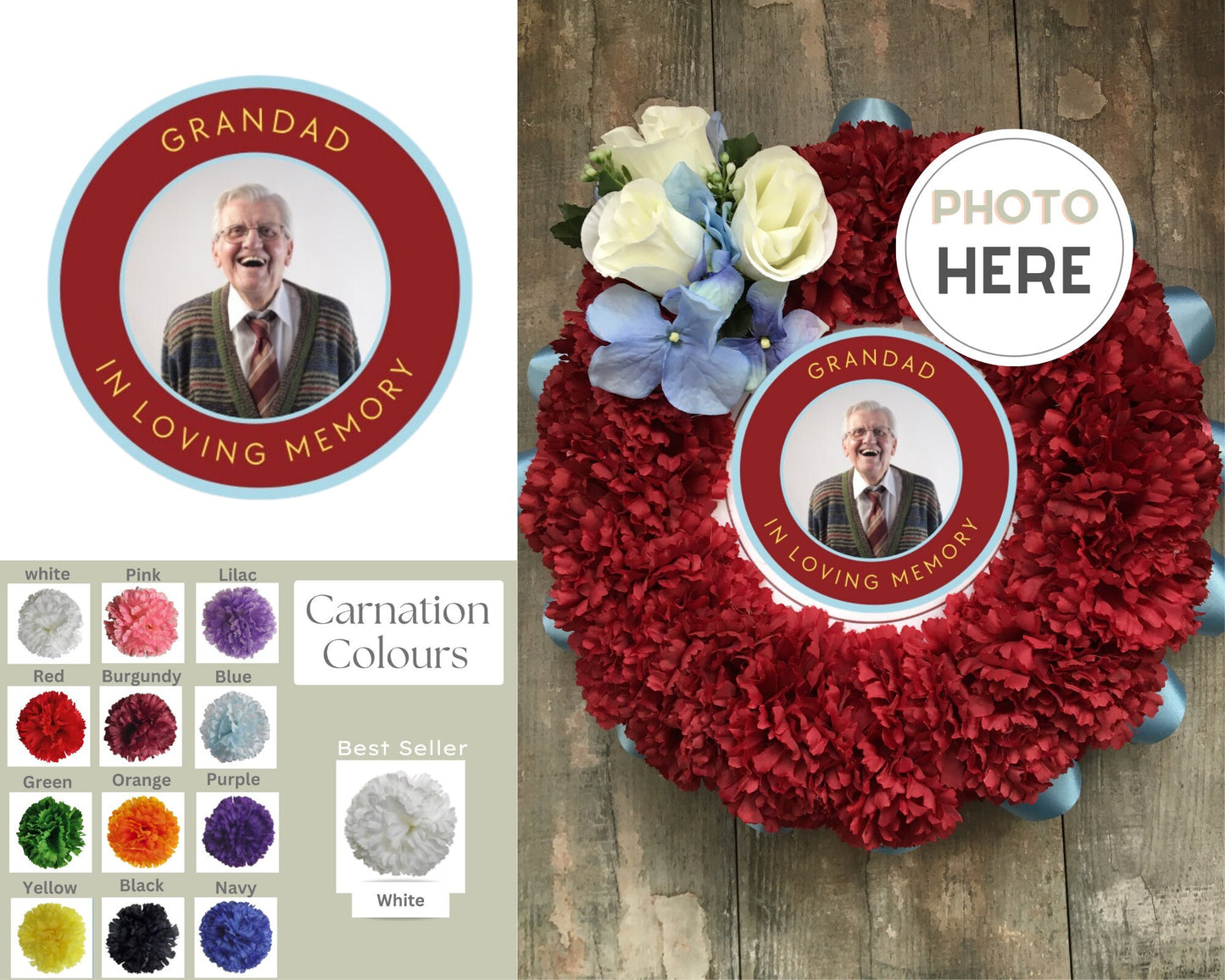 Add Photo To Your Funeral Flowers WE Add Your Picture To Wreath, Made From Artificial Silk Funeral Flowers, Waterproof Suitable For Grave Or Memorial Garden or Cemetery. Custom Hand Made Choose Any Colour From Carnation Base Drop-Down Menu And We Will Match The Rose Cluster Spray Then Personalise Ribbon Colour and Send Me Your Photograph.