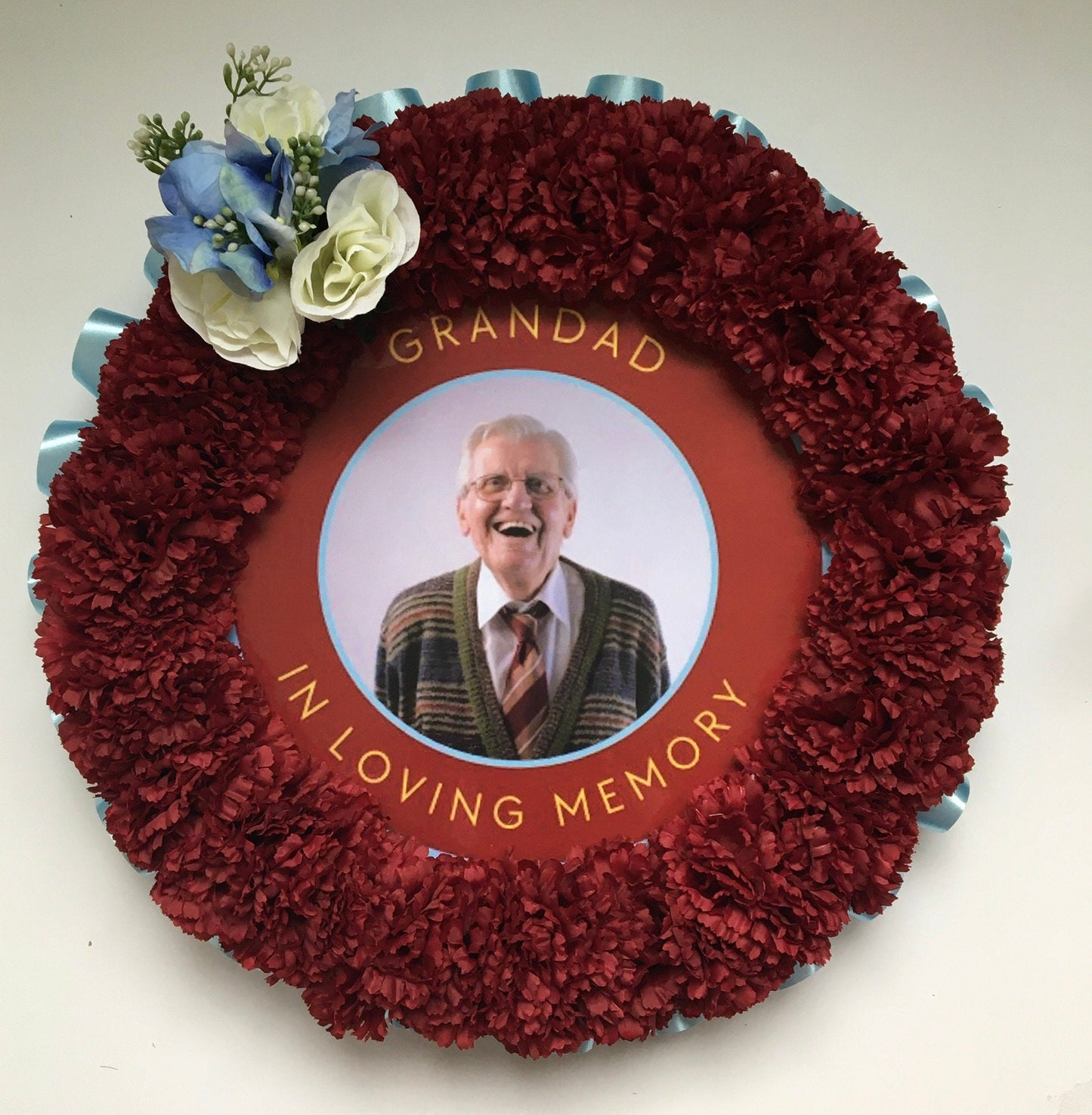 Add Photo To Your Funeral Flowers WE Add Your Picture To Wreath, Made From Artificial Silk Funeral Flowers, Waterproof Suitable For Grave Or Memorial Garden or Cemetery. Custom Hand Made Choose Any Colour From Carnation Base Drop-Down Menu And We Will Match The Rose Cluster Spray, Personalise Ribbon Colour and Send Me Your Photograph and I’ll customise the Wreath Posy.