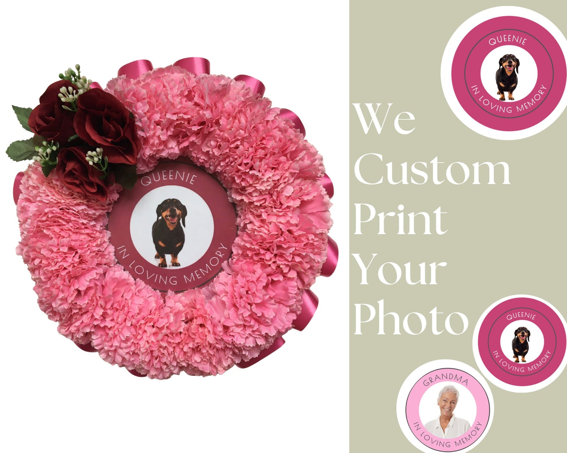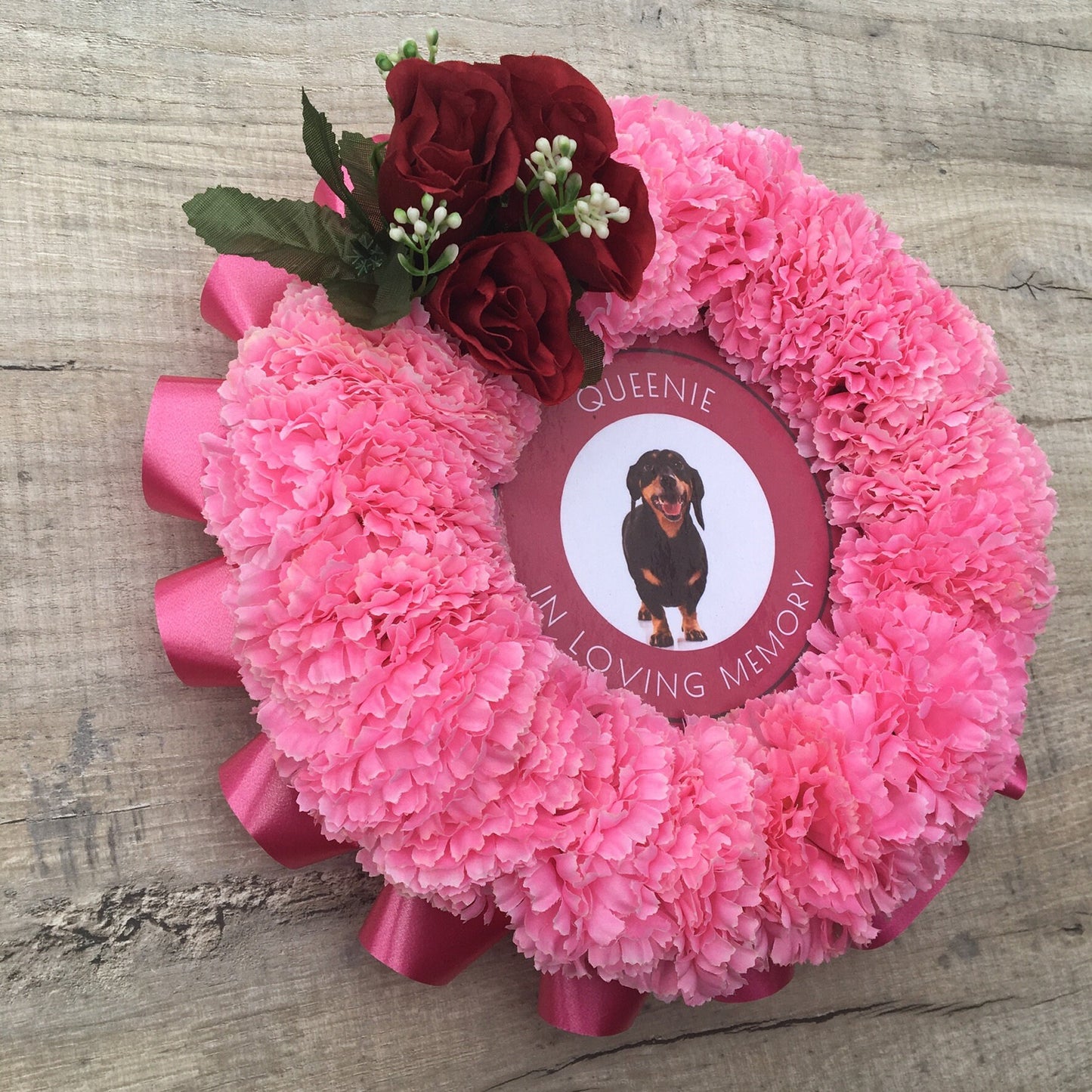 Artificial Silk Funeral Flowers For Pet, We Can Use Any Cat or Dog Photo of Your Choice and Print Out, this Pet Tribute is Waterproof Suitable For Grave, Memorial Cemetery. Custom Hand Made Choose Any Colour From Carnation Base Drop-Down Menu And We Will Match The Rose Cluster Spray Then Personalise Ribbon Colour.