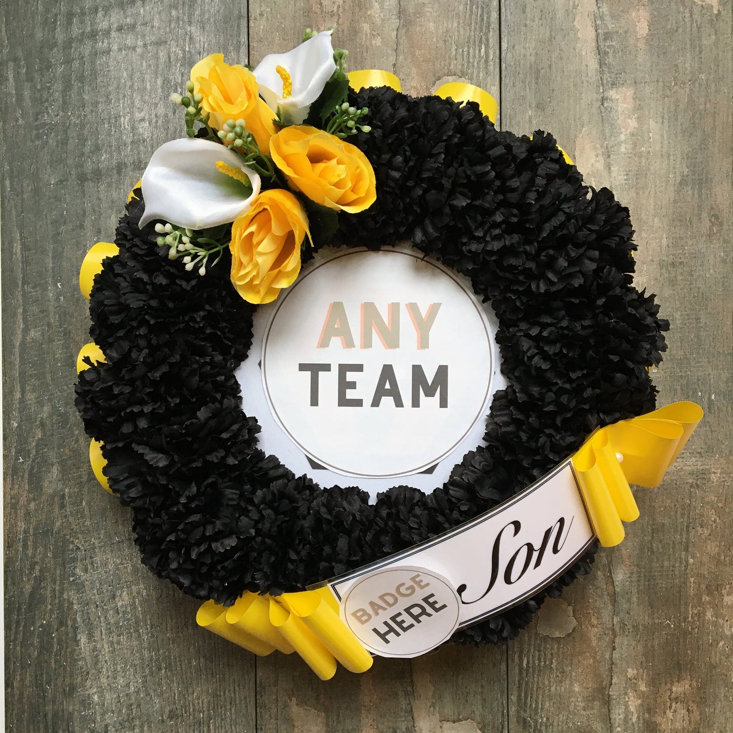 Football Team Wreath 2 Sizes, Made From Artificial Silk Funeral Flowers, Waterproof Suitable For Grave Or Memorial Garden or Cemetery. Custom Hand Made Choose Any Colour From Carnation Base Drop-Down Menu And We Will Match The Rose Cluster Spray Then Personalise Ribbon Colour and Send Me Your Team, Logo or Emblem.