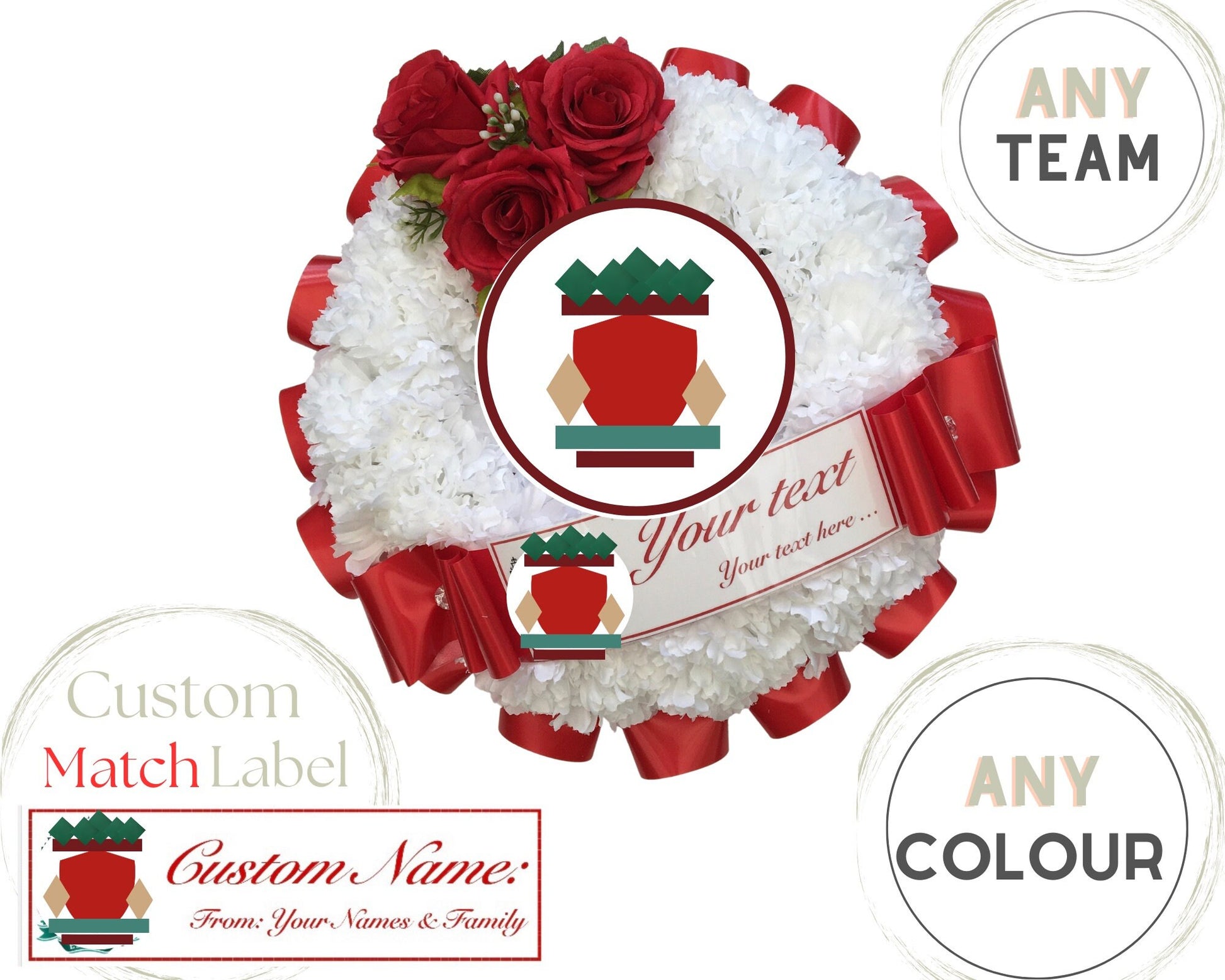 Add Team To Your Funeral Flowers WE Add Your football Team To Wreath, Made From Artificial Silk Funeral Flowers, Waterproof Suitable For Grave Or Memorial Garden or Cemetery. Custom Hand Made Choose Any Colour From Carnation Base Drop-Down Menu And We Will Match The Rose Cluster Spray Then Personalise Ribbon Colour.