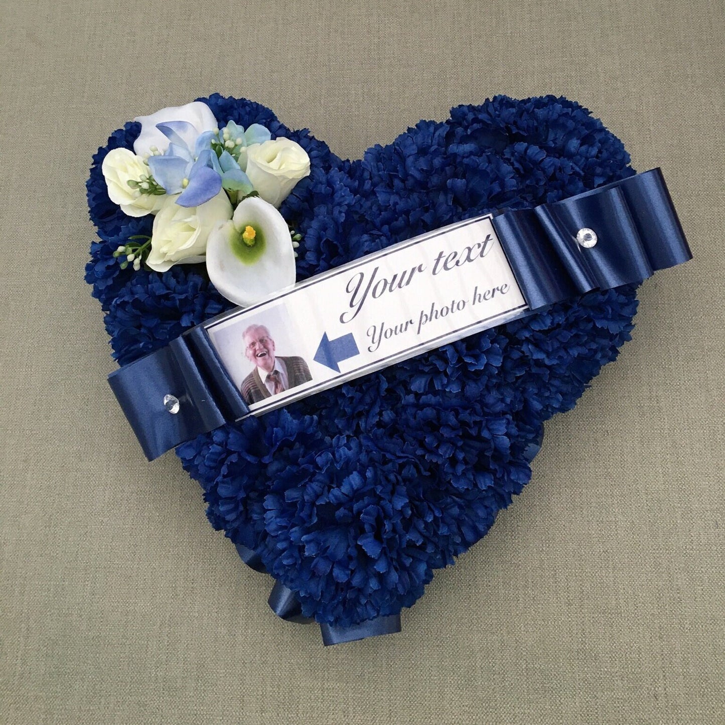 Funeral Flower Tribute Photo Keepsake Wreath for Grave Decoration, Heart Shaped Floral Wreath Personalised With Custom Photo Label of Your Loved One With Matching Ribbon Lable Sash including Printed Name and Message. Heart Silk Artificial Flowers With Any Name to be Printed, Any Colour, with Personalised Ribbon Label Sash, we can include a personalised photograph of your loved one, Name and message, see separate photo in listing, just leave a Message at checkout.